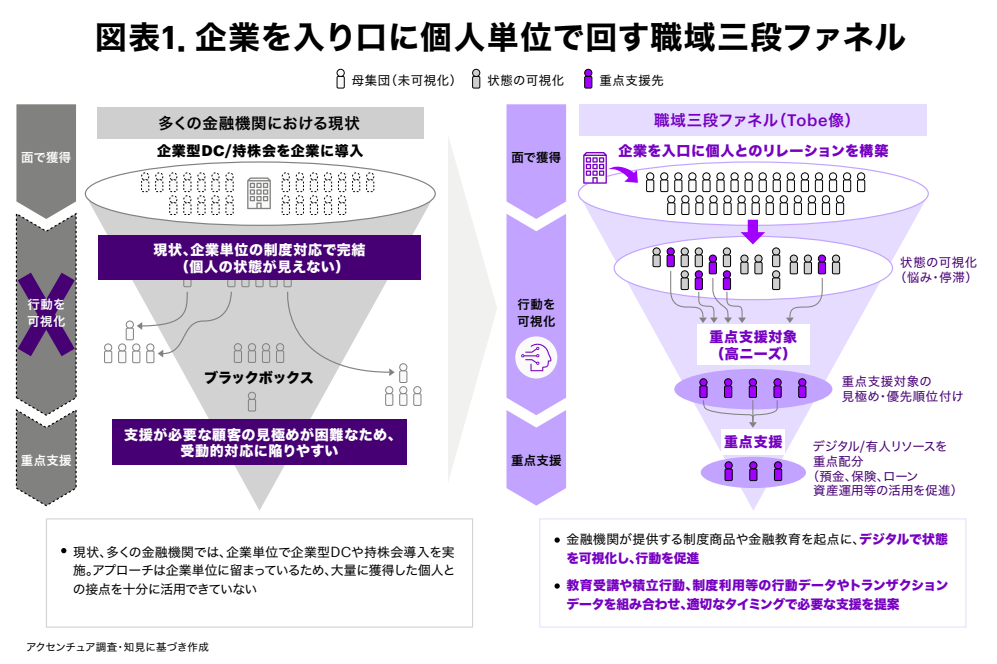 職域の制度は従業員一人ひとりの意思決定を前提に成り立つため、金融機関に求められるのは特定商品の推奨ではなく、意思決定を支える情報提供である。職域のような大規模な母集団に対し、個人単位の状態把握と継続的な関与を人手だけで担うのは現実的ではない。