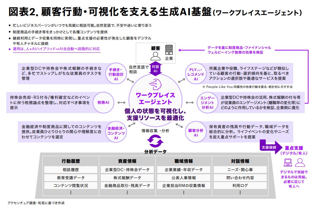 ワークプレイスエージェントは職域を運用モデルとして成立させる生成AI基盤であり、職域で発生するデータを個人単位で統合・分析して状態を可視化、自律的に支援内容を判断する(図表2)。