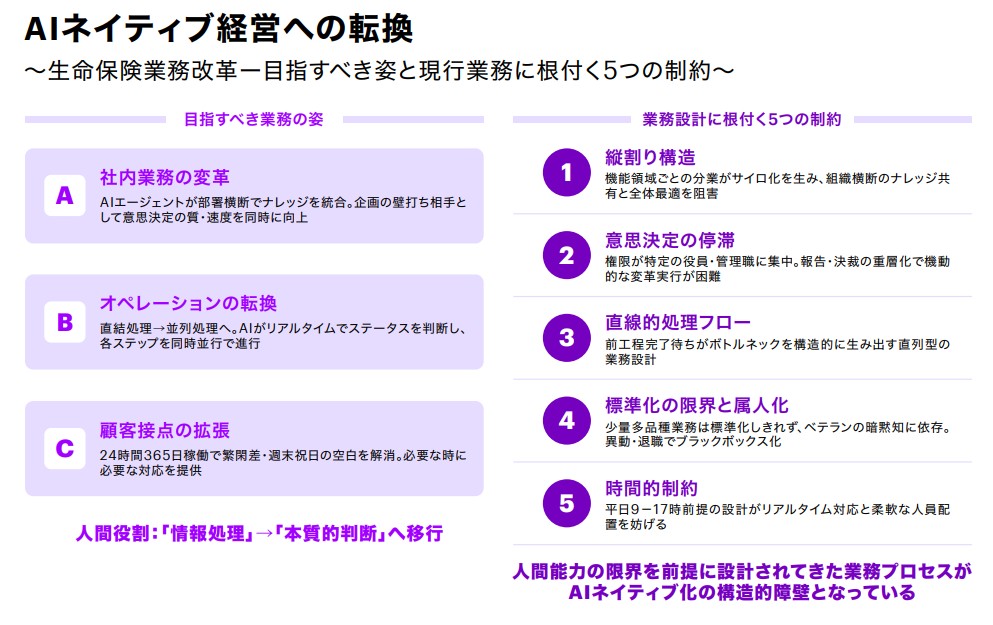 AIネイティブな生命保険会社の業務は、現在とは根本的に異なる設計原理で動く。