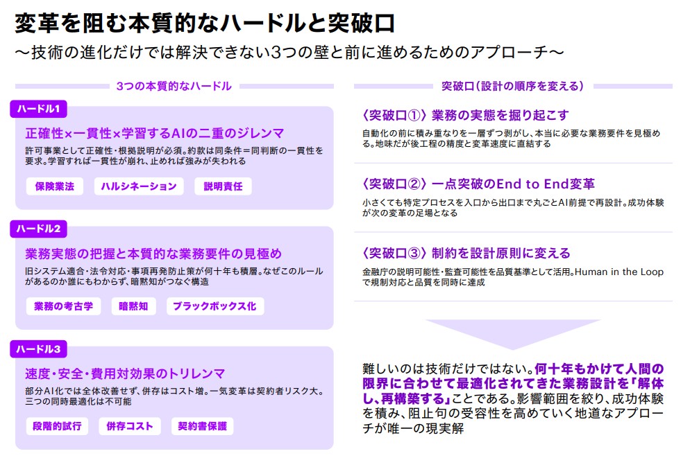 プロセスの一部だけをAI化しても、前後の工程が人手のままでは全体のスループットは改善しない。旧来の仕組みとの並存が長引けばコストが積み上がり、一気変革は誤判断が契約者の生活に直結する生命保険では特にリスクが大きい。変革の速度・安全性・費用対効果を同時に最適化する解は存在せず、段階を刻みながら試行錯誤を重ねるしかない。
